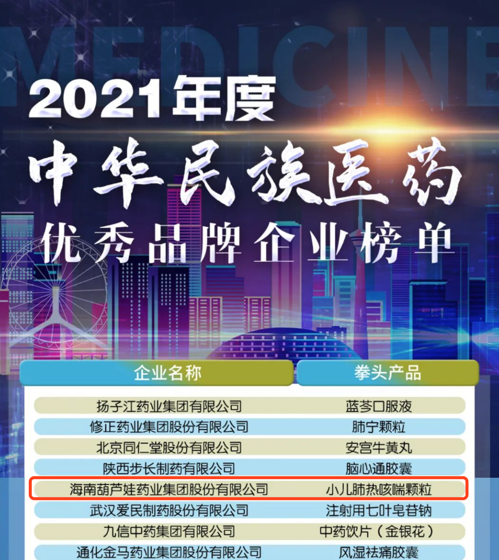 12月29日,全国工商联医药业商会发布了“2021年度中华民族医药优秀品牌企业榜单”,环球360药业集团凭借黄金单品小儿肺热咳喘颗粒(4克)实力登榜。