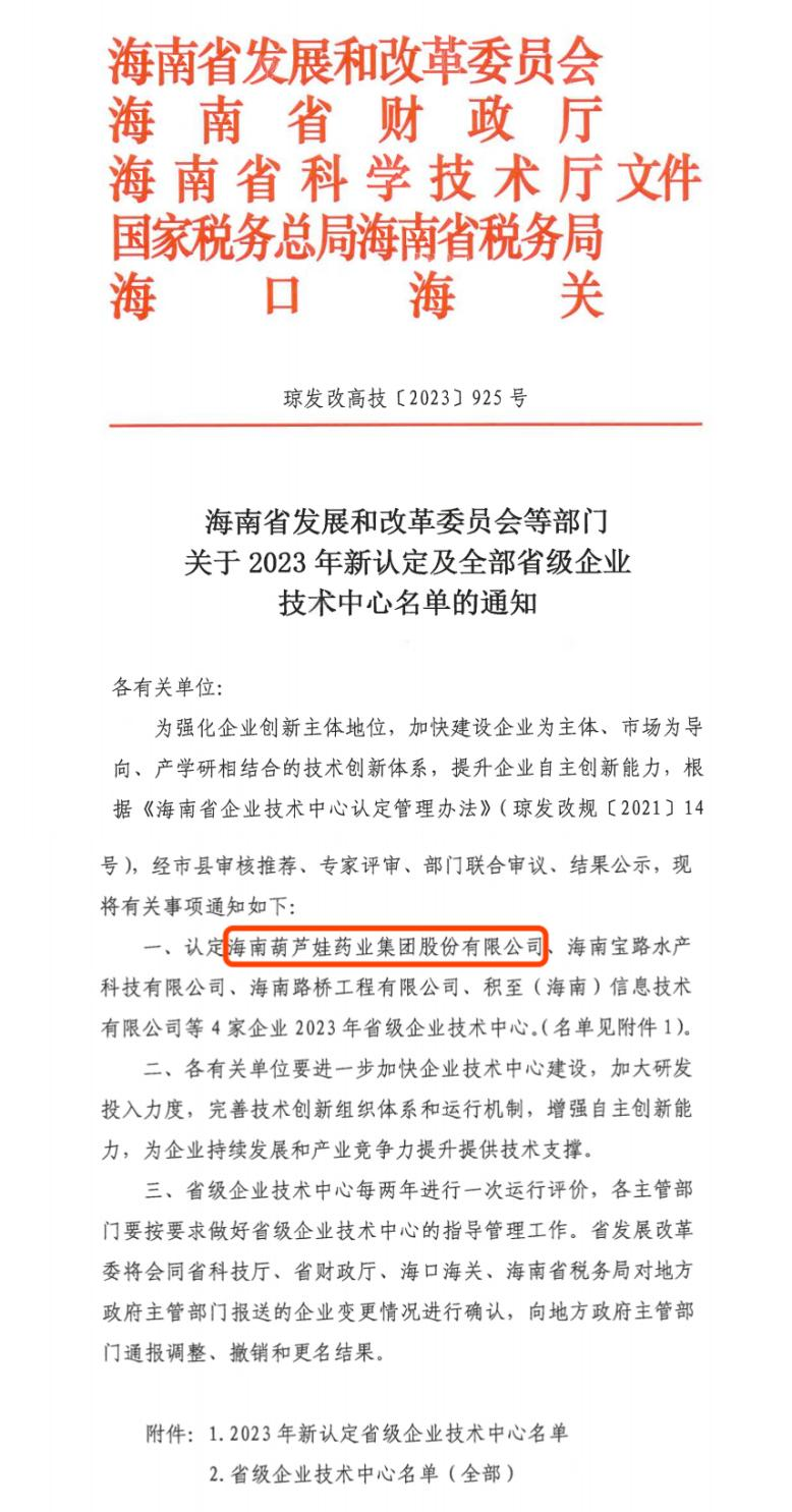 近日,海南省发改委等多部门联合公布了《关于2023年新认定及全部省级企业技术中心名单的通知》,其中,海南环球360药业集团股份有限公司成功通过评审,被认定为省级企业技术中心,是本次获批的4家企业之一。